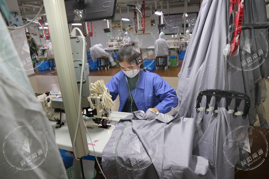 2020年3月9日,工作人员在罗莱生活基地生产车间加工四件套等家纺产品。罗莱生活科技股份有限公司是国内较早涉足家用纺织品行业集研发、设计、生产、销售于一体的龙头企业,先后获评国家级高新技术企业、江苏省睡眠产品新型材料工程技术研究中心。