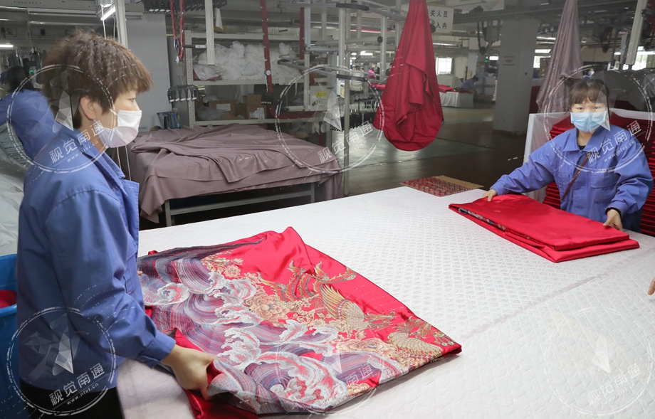2020年3月9日,工作人员在罗莱生活基地生产车间加工四件套等家纺产品。罗莱生活科技股份有限公司是国内较早涉足家用纺织品行业集研发、设计、生产、销售于一体的龙头企业,先后获评国家级高新技术企业、江苏省睡眠产品新型材料工程技术研究中心。