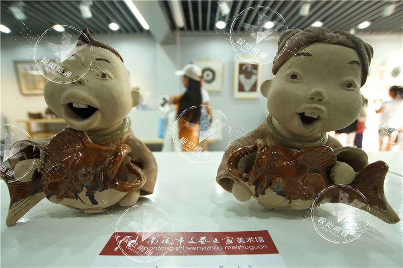 7月20日,观众在南通市首届民间工艺作品大赛获奖作品展上观看陶艺展品《丰收系列--年年有鱼》。记者 黄哲