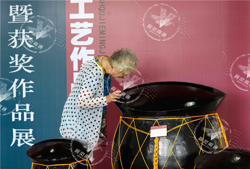 7月20日,观众在南通市首届民间工艺作品大赛获奖作品展上观看巨型风筝哨口。
