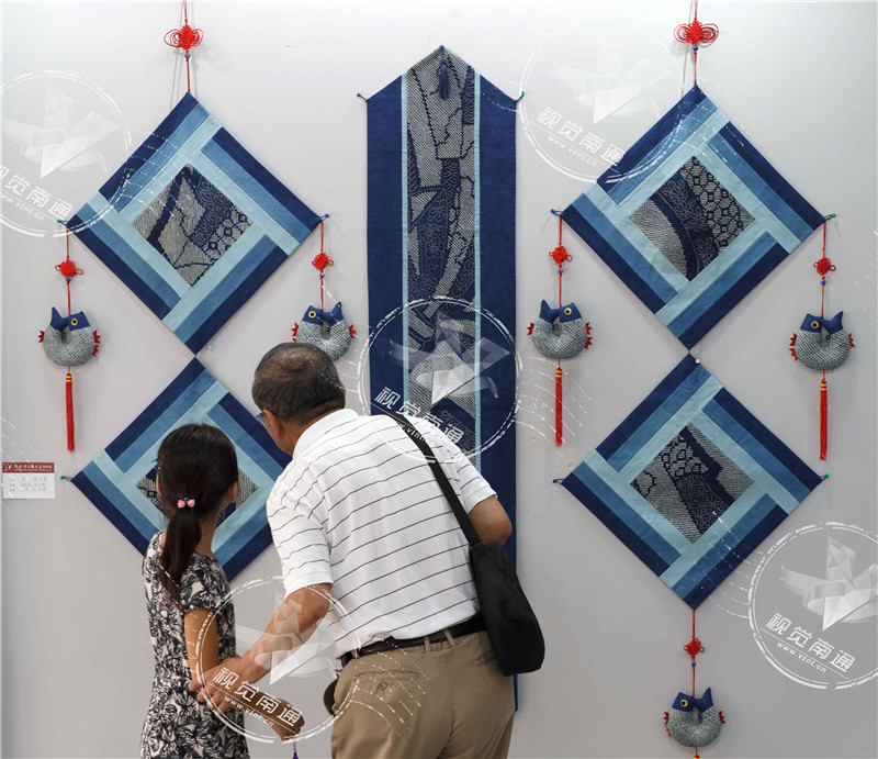 7月20日,观众在南通市首届民间工艺作品大赛获奖作品展上观看蓝印花布作品《鱼子缬桌旗》。记者 黄哲