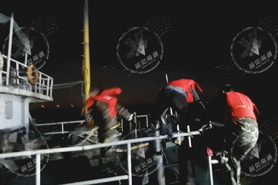 4月6日晚,海警执法员在夜幕下着救生衣准备出海追缉。
