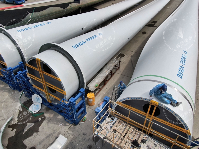 2021年4月21日在美泽风电厂区拍摄的风电叶片。 美泽风电设备制造(江苏)有限公司设立之初便布局在江苏海上风电基地,覆盖海上风电及南方陆上风电业务。 公司先后开发了适用于II类和III类风资源的大兆瓦叶片,具有自主知识产权的各型号叶片10余款,并在此基础上进一步开发适合于IV类风资源的叶片产品以及海上风电叶片产品。2020年公司实现销售1.2亿余元,纳税300余万元,荣获通州湾示范区2020年度工业纳税十强企业、2020年度开放型经济十强企业。