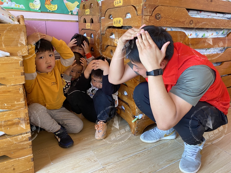 在科普过后,根据预设的15时广播警鸣声响起,安全防震紧急疏散撤离演习正式开始。孩子们在社区志愿者的带领下,双手护头,紧急有序的在20秒时间内成功在墙角、桌角等相对安全的地方进行躲避。除了防震演习,此次还设置了火灾逃生演习。孩子们第一时间将事先准备好的毛巾打湿,捂住耳鼻,自觉排成队列弯腰快速通过。中二班的李老师介绍到,天玺幼儿园每年都要进行好几场此类演习。