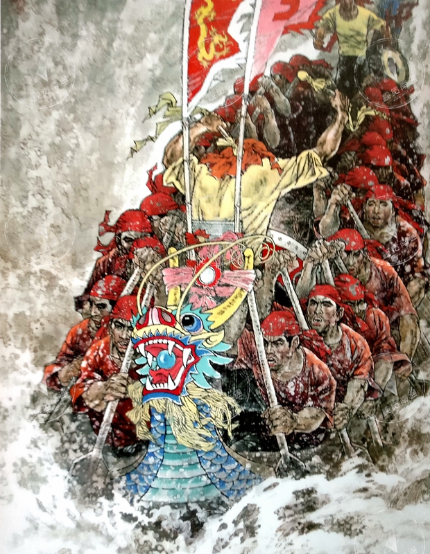 沈启鹏,1946年生于南通。1980年加入中国美术家协会,1988年结业于北京中国国家画院研修班,先后在江苏省国画院、南通书画院从事专业创作,2000年进高校任教。作品多次入选全国美展、全国青年美展和北京国际美术双年展并有获奖,众多作品为中国国家博物馆、中国美术馆和江苏省美术馆收藏。现为中国美协会员、国家一级美术师、南通市美协名誉主席、南通书画研究院名誉院长。“鼓声三下红旗开,两龙跃出浮水来。棹影斡波飞万箭,鼓声劈浪鸣千雷。”龙舟竞渡是中国民间传统的习俗,可以追溯到先秦时代祭祀水神或龙神的仪式,后来通常成为端午节凭吊爱国诗人屈原的纪念活动,也成为中国全民健身的竞技项目。1984年中国体育委员会决定把龙舟竞渡列为正式比赛项目。沈启鹏告诉记者,“当初创作的这件作品主要采用俯冲式的视角表现龙舟比赛的桡手们在紧锣密鼓声中奋力划桨、劈波斩浪的雄姿,体现了中华健儿团结奋斗、勇于拼搏的进取精神。