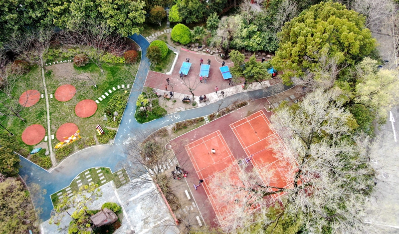 3月22日,无人机航拍南通第一个街道体育公园——虹桥公园春天美景。虹桥公园建于20世纪80年代,作为虹桥新村的配套公园,其体育设施、文化服务辐射周边,每年入园参与体育健身、竞技的居民累计3万人次。