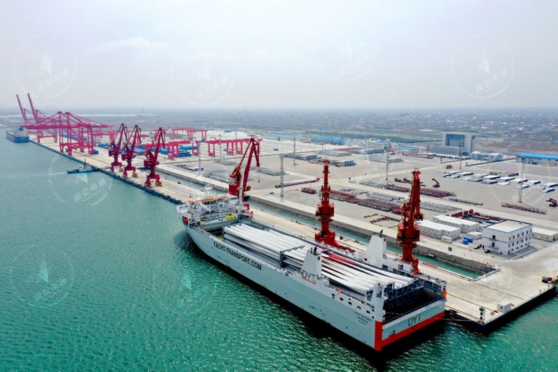 4月1日,吕四起步港区 “2+2”码头通用泊位上,“游艇服务者”轮正在进行装载作业。该轮长214米、宽46米,共装载风电叶片90片、设备106件,为目前世界上装载量最大的风电叶片海轮。