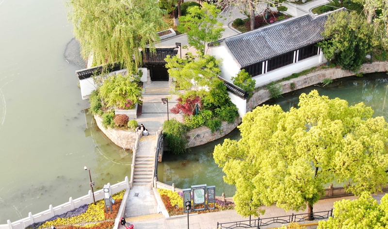 4月18日,无人机航拍怡园秀丽春景。怡园占地面积约0.35公顷,四面环水。怡亭坐落于内,北临濠河,亭有联云“濠流明净天开镜,生意回旋柳展眉”。此处为江苏省第一代用师范党支部成立旧址,也是南通地区最早的地下党组织成立纪念地之一。怡桥毗邻怡园而建,桥身五孔,长60米、宽16米,气势宏伟。