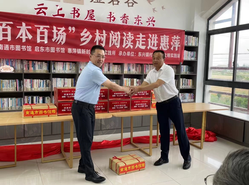 31日上午,南通市图书馆“百本百场”乡村阅读活动走进启东惠萍镇。当地居民代表齐聚东兴镇村“云上书屋”,共同见证“百馆荐书全省共读”项目推荐图书捐赠仪式。