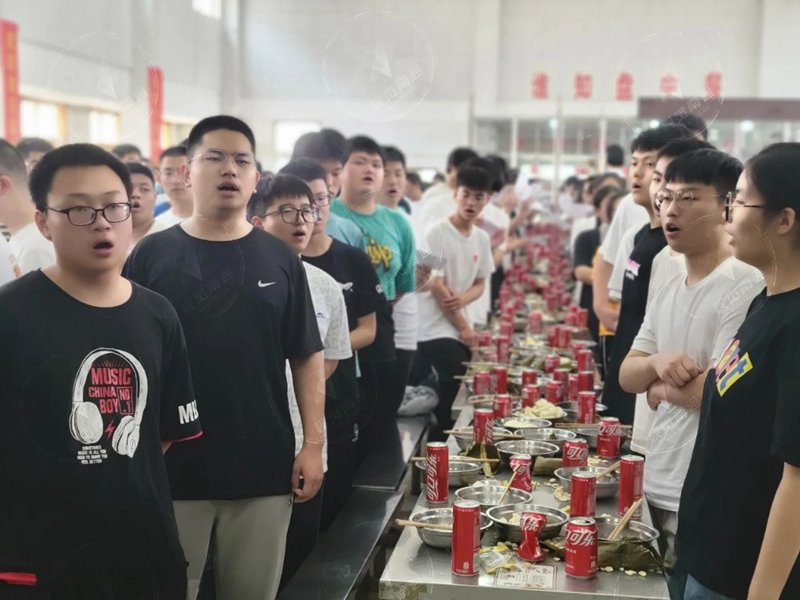 在食堂的饭桌上,学校为高三学子准备了一罐印有名字的定制可乐。在红色的可乐包装罐身上,还印有“战无不胜,金榜题名”八个大字。