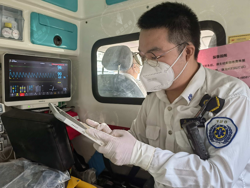 谷裕熟练地用温度计为老人测量耳温,并询问家属老人基础疾病。驾驶员唐伟明和担架员陈德明将老人从病床搬动到电动担架上。上车后,谷裕为老人进行心电监护,检测血压、心跳、血氧饱和度,书写电子病历。“我初步判断这是因为长期卧床导致的肺部感染,已经将相关信息通过网络发给市三院抢救室。”