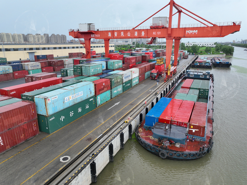 2023年7月19日拍摄的海安商贸物流园忙碌的凤山码头。今年上半年,凤山码头引进大型国企中外运参与运营,采取“集散并举”的思路拓展区域市场,集装箱完成15000标箱,同比增长65%。