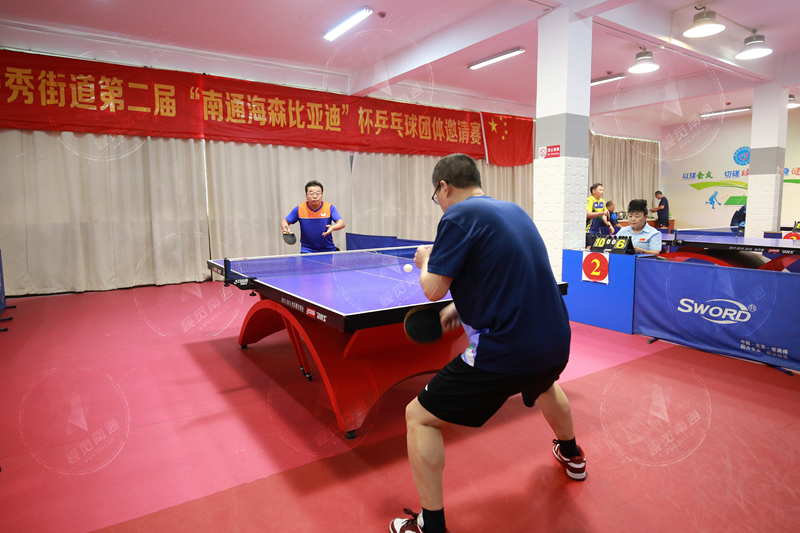 8月5日,崇川区钟秀街道第二届“南通海森比亚迪杯”乒乓球团体邀请赛在南通濠友乒乓球俱乐部举行,近50名乒乓球爱好者通过切磋球艺的方式迎接“8·12”南通体育日。