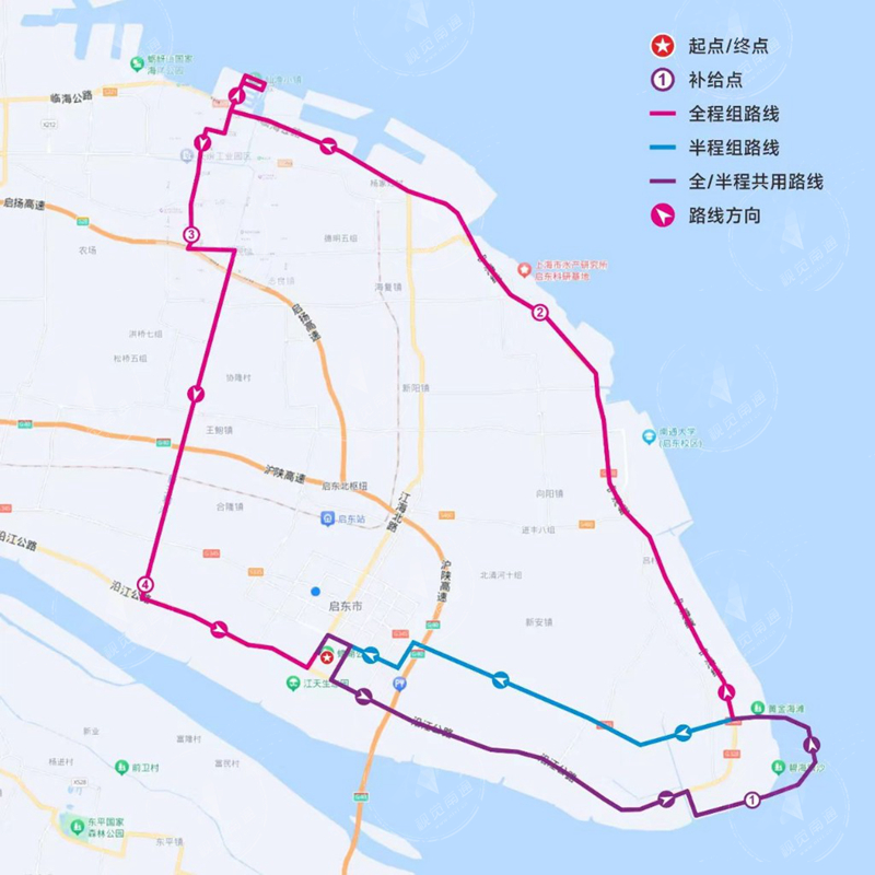 本次比赛分男女全程和半程组。全程组骑行路线为钱塘江路(文体中心)—右转江海路—右转世纪大道—右转建设南路—左转沿江公路—右转江枫路—左转景观大道(第一补给点)—右转双色海大堤—右转宁海线—江海澜湾补给点(第二补给点)—右转如意大道往北—右转堤顶公路—左转如意大道—右转天斧路—左转天江公路—左转南巴线—右转吕北公路—右转G345—左转吕北公路(北新第四补给点)—左转沿江线—左转江海南路—右转钱塘江路(终点)道路为柏油路面,总里程约168公里。