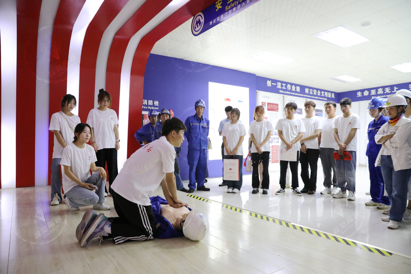 实践小分队首先走进该企业的船厂,与船舶工人面对面座谈交流,了解他们工作的基本情况,加深了对船舶工人的工作内容与职责的认识。并将“清凉爱心包”送到工人手中,把关心送给在高温下辛勤劳作的工人,为忙碌在一线的工人“充充电”,也向坚守一线的船舶工人致敬感谢。为加强船舶工人们对各类突发事件的应急处置能力,实践小分队成员就心肺复苏、人工呼吸等具体操作进行了详细讲解,帮助大家正确掌握急救知识和技能。