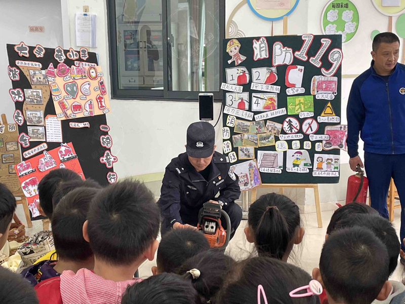 在茅家港幼儿园,社区民警彭从祥制定好消防疏散方案和合理逃生路线,向孩子们讲解了疏散过程的注意事项。随着警报声响起,孩子们在老师的指导下迅速到达了指定位置。在孩子们的活动区,民警按照“会逃生、会灭火”要求,现场讲解灭火器的使用方法,并对现场模拟火点进行灭火指导,萌娃们听得津津有味。