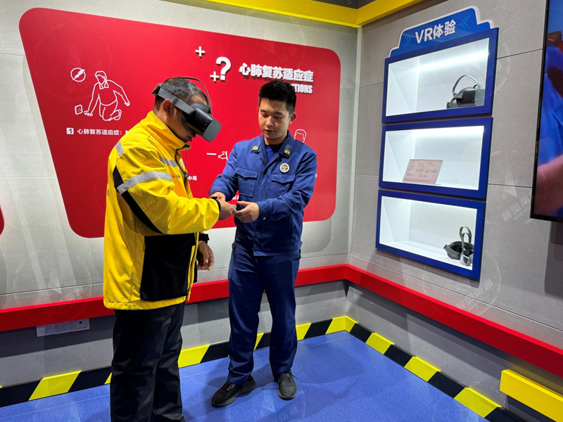 接着,骑手们参观了消防科普教育馆,通过模拟火灾隐患查找、灭火实验、VR虚拟体验应急逃生、心肺复苏应急救护等直观的方式,骑手们“沉浸式”学习了消防器材使用方法和火灾逃生急救技能。