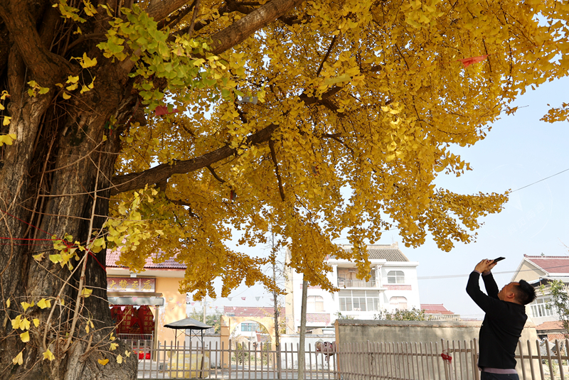 “因今年初冬气温较高原因,古银杏树最佳观赏期比往年推迟两周左右。”卢庄村党总支书记缪石军介绍,近年来,各级部门加强对这棵千年古银杏树的保护力度,省级财政资金用于古树名木生境改善、抢救复壮、文化宣传等,鼓励整合市县财政资金支持绿美村庄建设,同时创新机制,吸引多元化资金参与绿化建设。