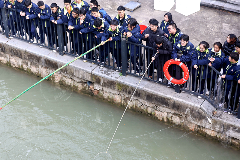拍打水面、缓收渔网、抱起大鱼……学校河道内的现场捕鱼让很多没有见过捕鱼场景的同学们分外兴奋。在桃源河两畔,只要是有鱼出水,总能迎来高三学子们的震耳欢呼,开心写在每个人的脸上。