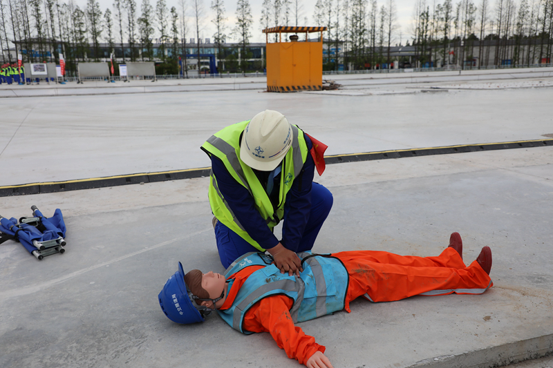在这场没有硝烟的战斗中,医疗救护组同样扮演了至关重要的角色。当演练中突发“施工人员受伤”的紧急情况时,他们迅速响应,以专业的技能对伤者进行了初步救治,并安全转送至医院,展现了极高的专业素养和应急处理能力。
