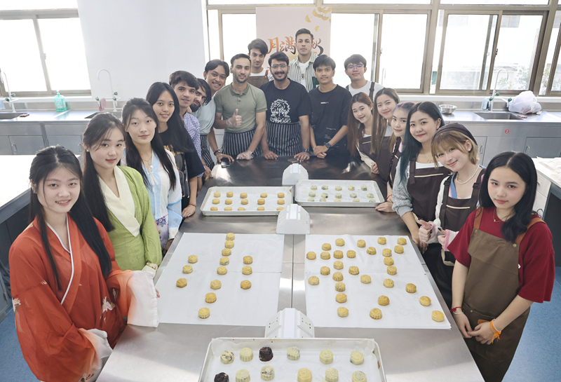 活动现场,中国学生首先向留学生们介绍了中秋节的历史渊源和文化习俗,让大家对这一中国传统节日有了更深入的了解。随后,现场演示讲解月饼的制作过程,从按扁面团、揉搓馅团到模具定型,每一个步骤都讲解得细致入微。随后,留学生们便纷纷动手尝试制作,大家在刚开始时手法略显生疏,但在中国学生的耐心帮助下,很快便掌握了制作月饼的技巧。一时间,各式各样的月饼在大家的手中诞生,有的圆润饱满,有的造型独特,现场充满了欢声笑语。