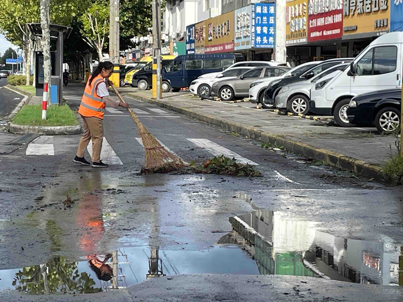 受台风“贝碧嘉”影响,部分路段一片狼藉,道路残枝、落叶、淤泥,垃圾增多,窨井口被杂物堵塞,兴环环卫应急小分队迅速转变为清理小分队,对辖区内的保洁情况进行了全面排查。市区五一路上,兴环环卫濠东所保洁员徐小格用大扫把清扫满地的落叶树枝,再由同事张小丽配合用小扫帚扫到簸箕里,倒到三轮保洁车的垃圾桶里。徐世军开着垃圾清运吊桶车前来支援,帮助他们一起将装满落叶、树枝杂物的垃圾桶挂在吊桶车后面,倾倒压缩处理。
