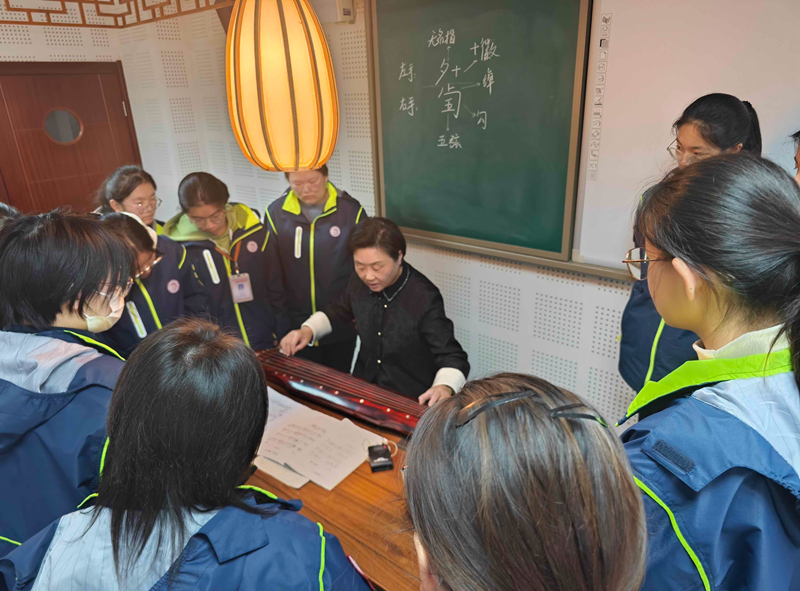 课堂上,梅庵琴社理事顾艳与通大附中高级教师、江海美育基地音乐项目负责人王亮联袂献上琴歌《秋风词》,悠扬的琴音与深情的吟唱交织,将学生们带入李白笔下那凄清而深远的秋日意境之中。随后,师生间展开了关于诗歌与古琴艺术的深度互动,从诗歌的“回环往复”之美,自然过渡到古琴技法中的“吟”“猱”等精髓,让学生们在文学与艺术的交融中领略古琴的无穷魅力。在互动环节,学生们还在老师们的悉心指导下,亲手尝试弹奏古琴,体验这一古老乐器带来的独特乐趣。
