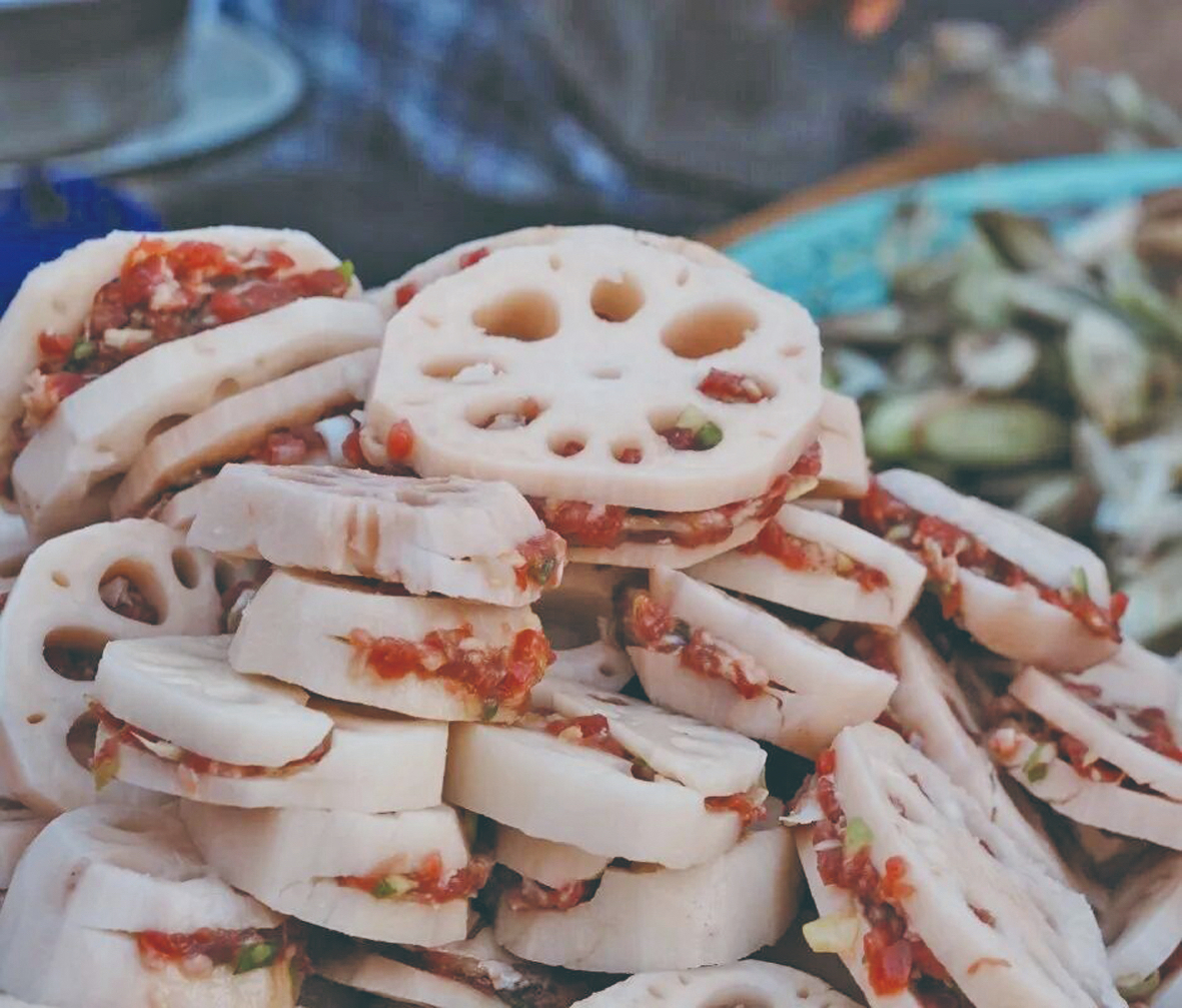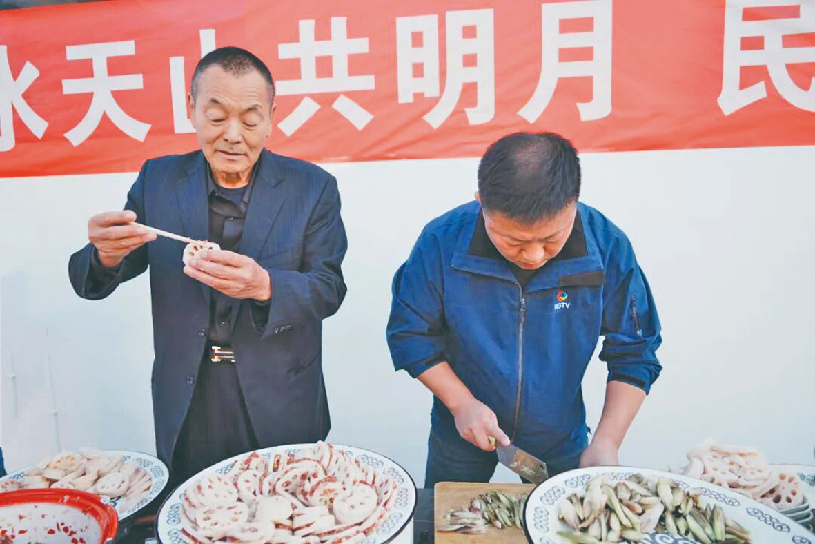 哈萨克族村民暑兰、维吾尔族村民苏毕衣第一次学着包藕饼,边学边听如皋支边人丁忠杰讲如皋习俗:“如皋人过中秋节都要包藕饼,莲藕莲藕嘛,盼着大家相亲相连,圆圆满满呢。”
