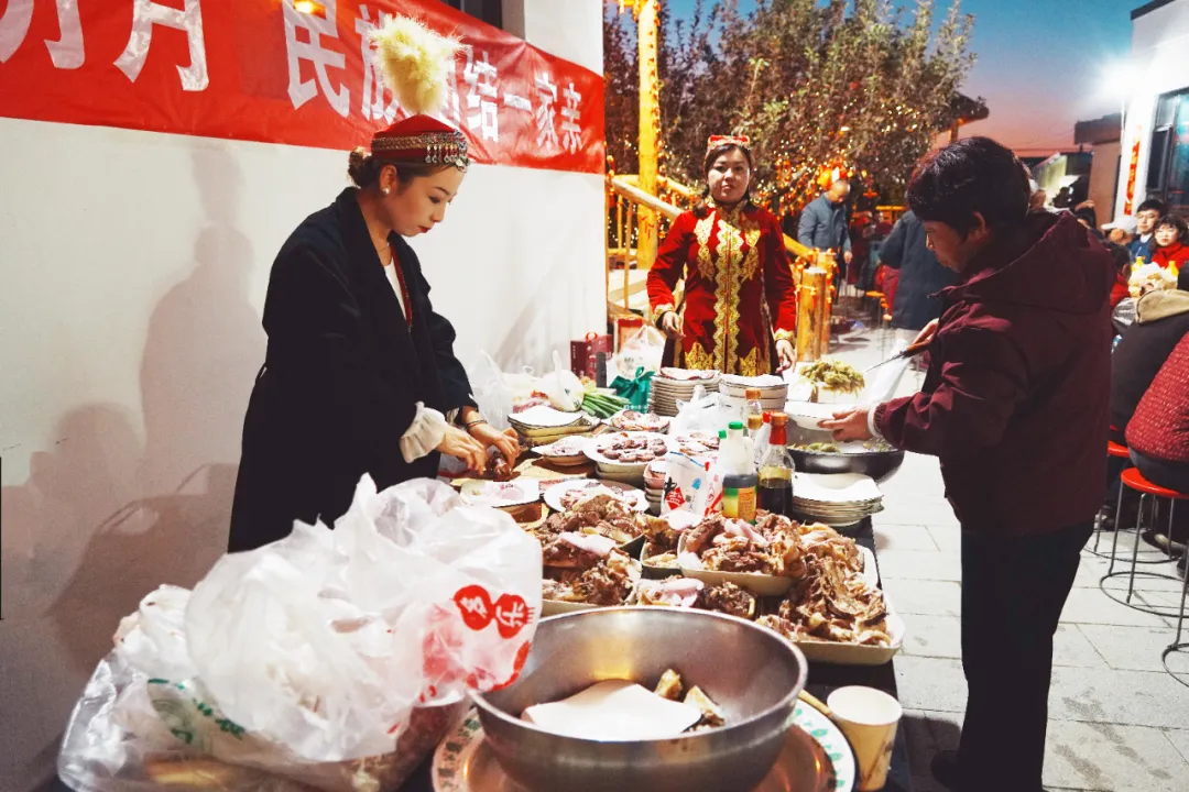雉水风物与天山风味跨越山河,在饭桌上相遇。黑塌菜、香堂芋、下原蘘荷、细荚花生等来自“世界长寿乡”如皋土生土长的富硒食品热气蒸腾;新疆烤全羊、牛肉、手抓饭、大盘鸡等色泽诱人、香飘满院。长桌中央一盘盘分别产自如皋、伊宁两地的石榴,颗颗紧紧相拥,像极了此刻团聚的各族亲人。