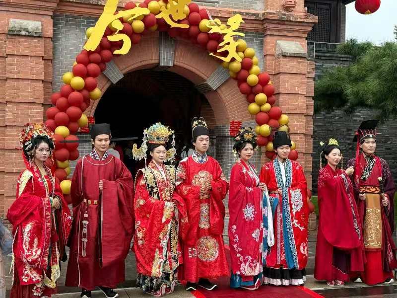 活动当天,南通钟楼广场装扮一新,新人伴着古典民乐依次入场。现场不仅有“汉舞+民乐”表演,古筝独奏《高山流水》尽显东方韵味,更通过“服饰快闪”环节展示了“一带一路”共建国家丰富的婚俗文化。在仪式核心环节,新人遵循汉代传统,庄重完成“沃盥礼、合卺礼、结发礼”,并在钟楼与濠水的见证下集体宣誓,新人家长及亲友团现场送上祝福。