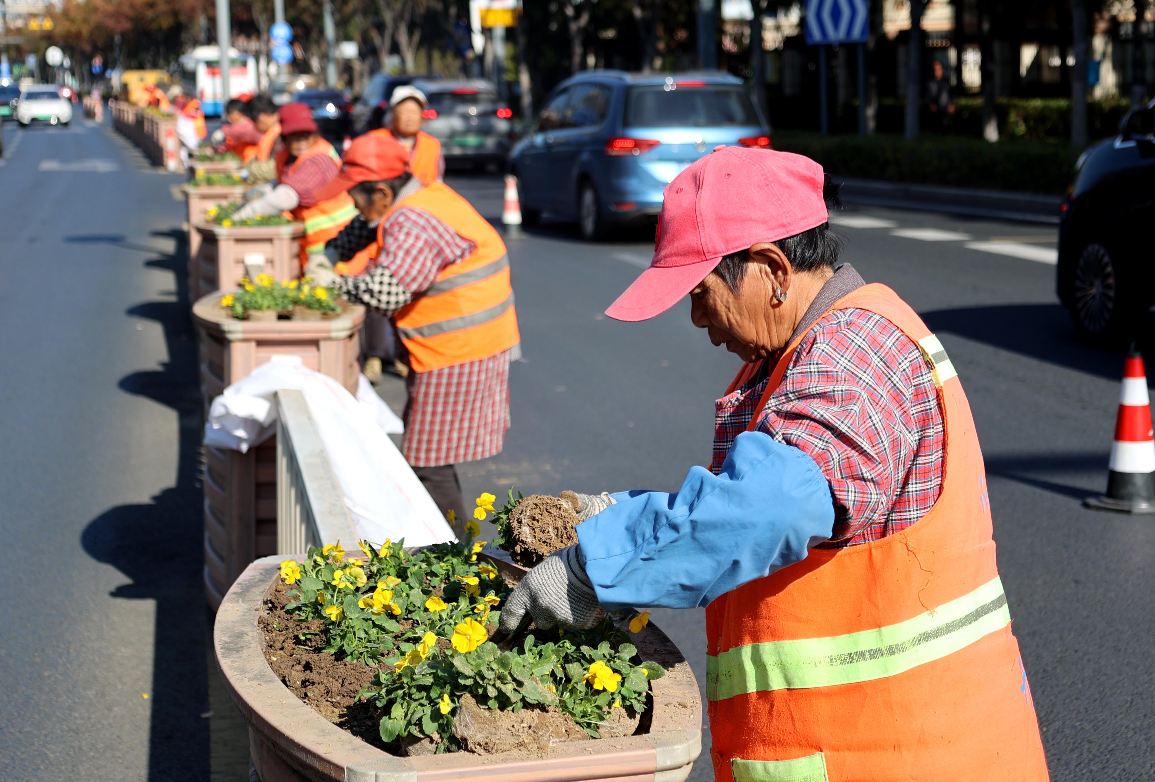 11月5日,南通开发区园林建设有限公司的绿化作业人员在市区跃龙路为花卉换季。立冬节气临近,绿化部门在市区主干道、公园等处更换花卉,将品种菊等秋季花卉换成角堇等冬季花卉。