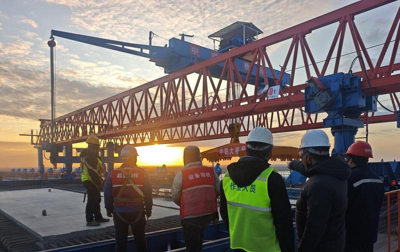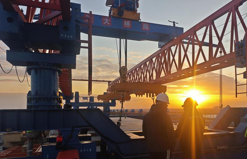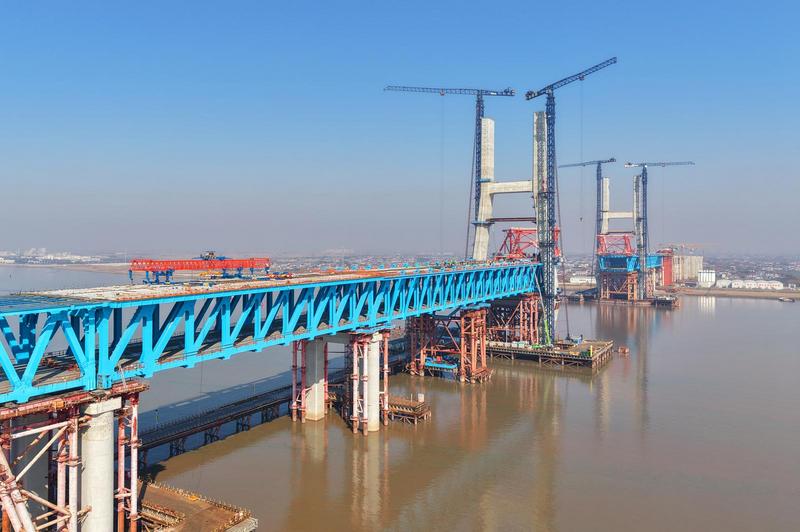 崇启公铁长江大桥主通航孔桥南侧边跨公路桥面板铺架完成