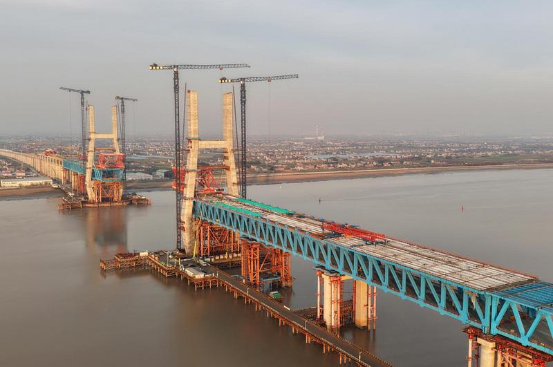 崇启公铁长江大桥是上海至南京至合肥高铁控制性节点工程,全长4.09公里,横跨长江入海口北支航道。其构造为双层布置的公铁两用桥,上层为双向6车道、时速100公里的一级公路,下层为时速350公里的双线高速铁路+时速250公里的双线城际铁路。其中主通航孔桥为主跨400米双塔双索面钢桁结合梁斜拉桥,是世界最大跨度双塔双索面公铁两用无砟轨道斜拉桥。