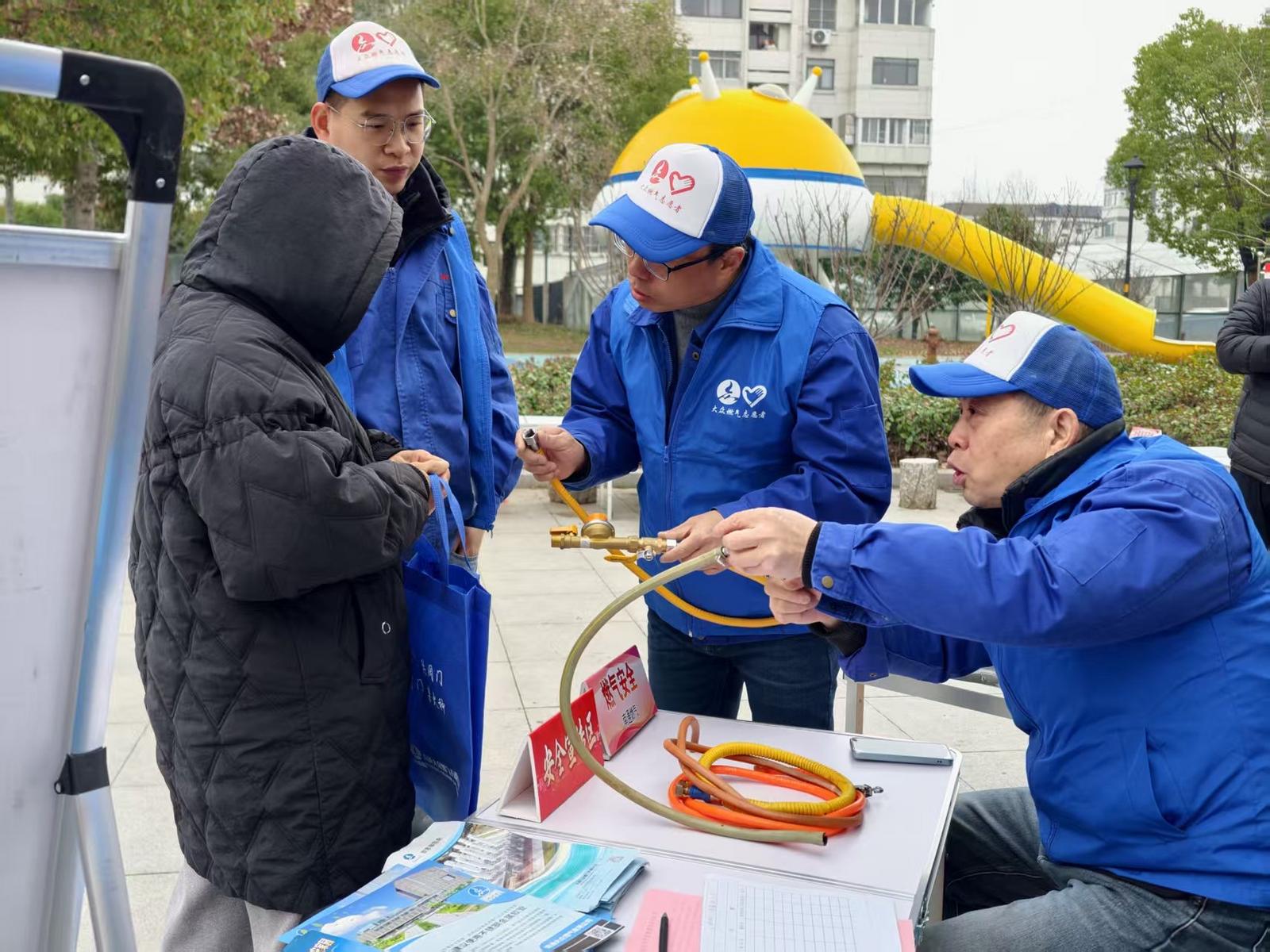 “阿姨,您家燃气软管还是橡胶的吧?那个容易老化,换成金属波纹管更安全!”“老师傅,这台灶具用了十几年啦?该让它‘退休’咯!”活动中,志愿者依托“徐智洲工作室”,在北濠东村社区先锋广场等地开设“用气安全市集”,用拉家常、讲案例、看实物的通俗方式,普及安全用气、隐患自查、应急处置知识,现场发放《燃气安全手册》,解答群众用气疑问。