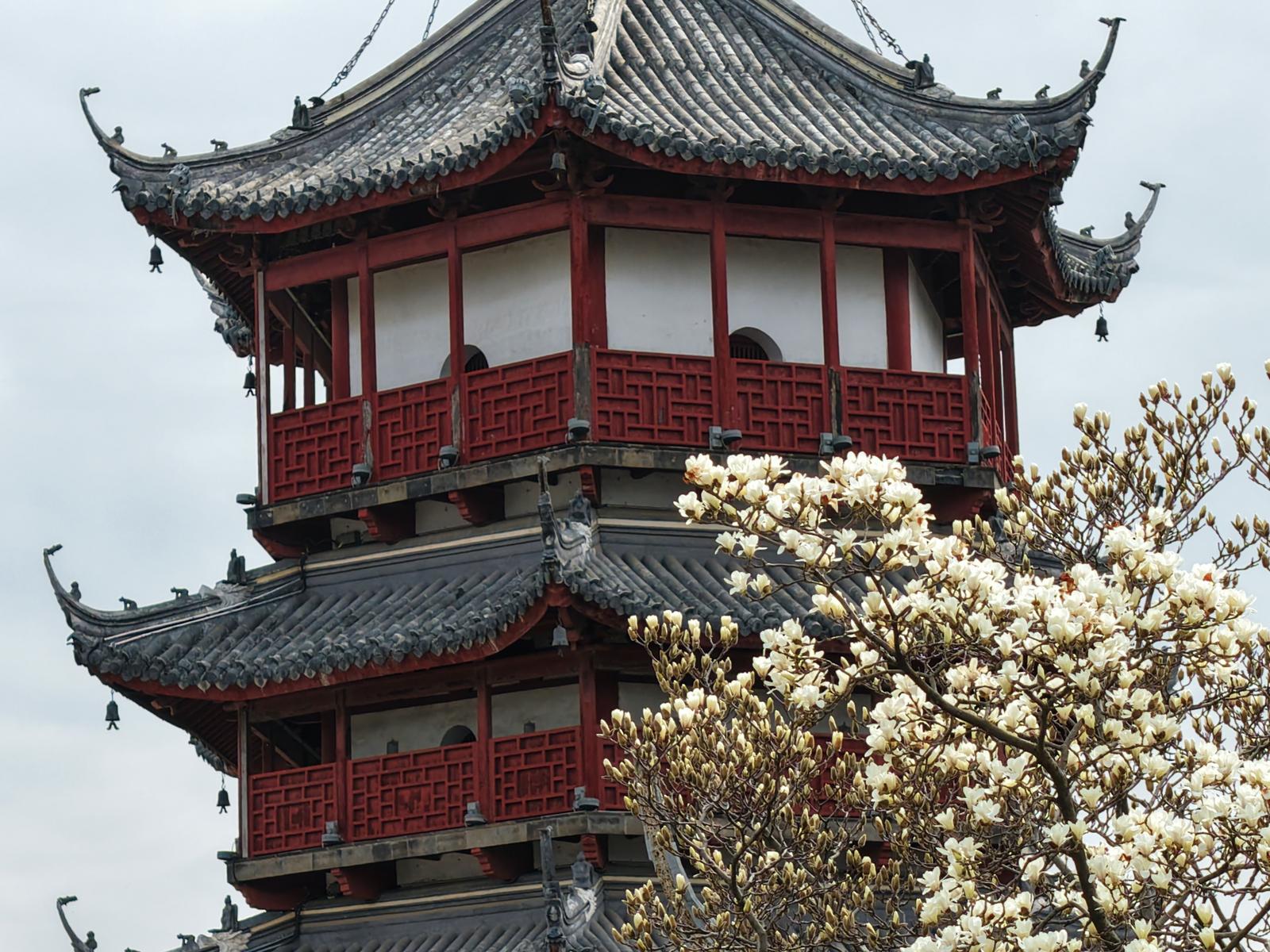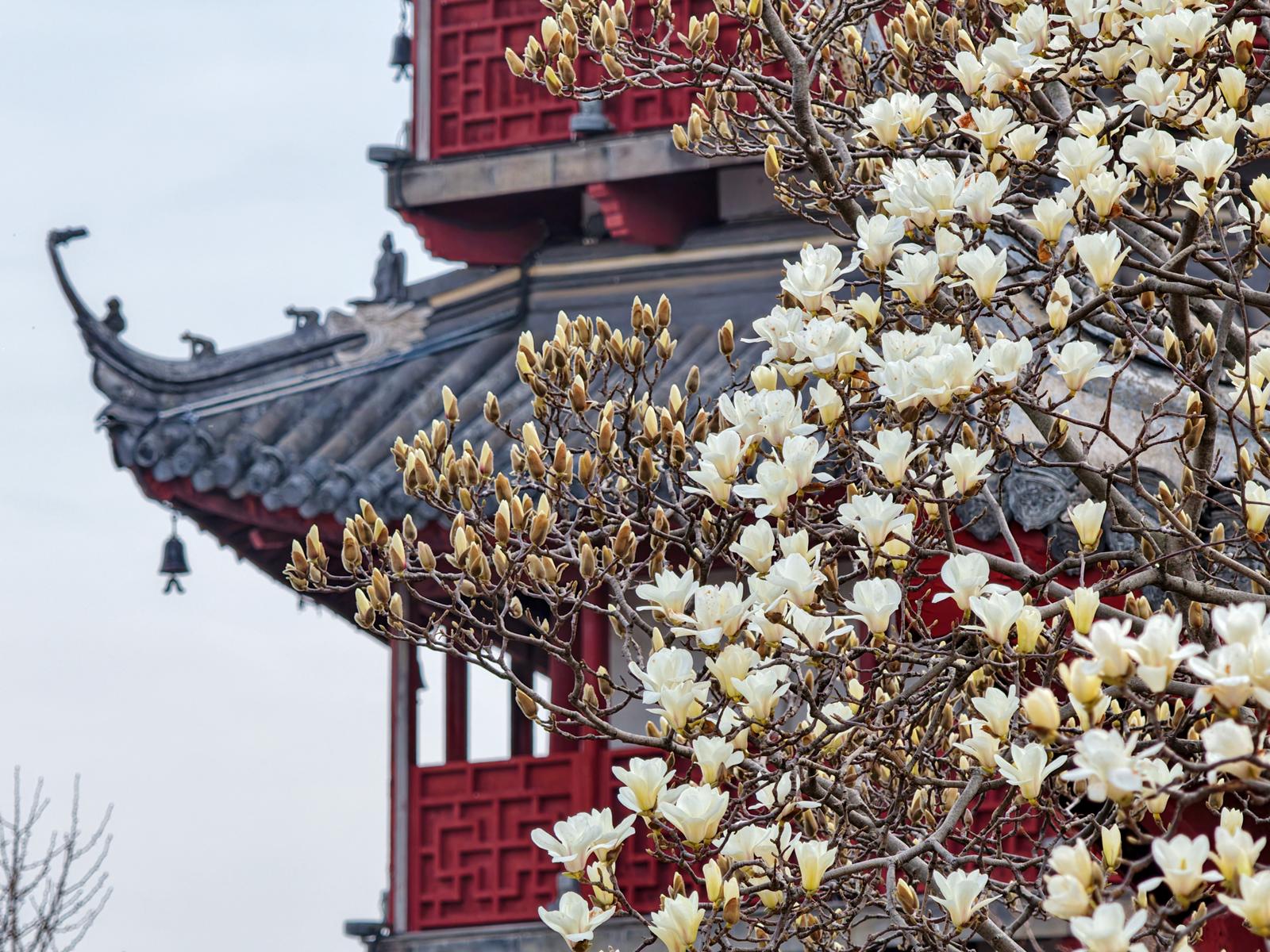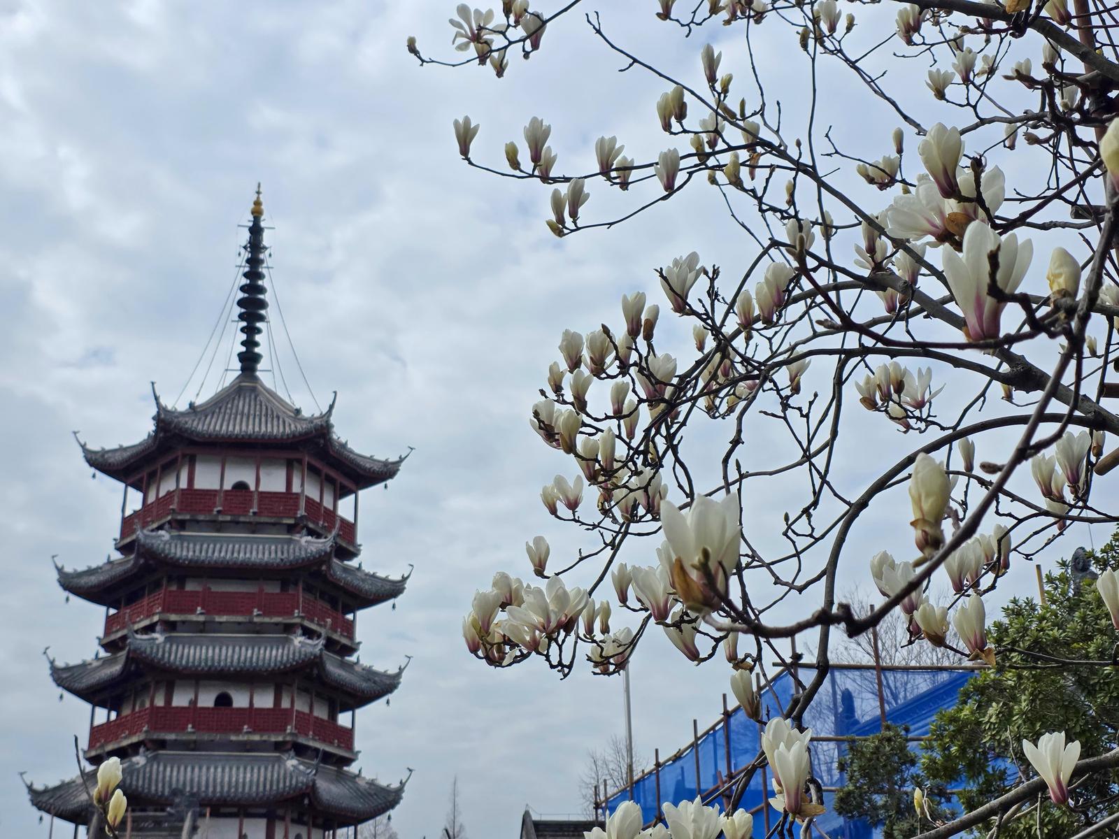 2026年3月8日拍摄的南通文峰塔和玉兰花美丽景色。眼下,在文峰塔附近的多株玉兰逐渐盛放,与文峰塔相映成景。南通文峰塔为南通三塔之冠,位于文峰公园北侧,有一组明清建筑,园林风光别具一格。