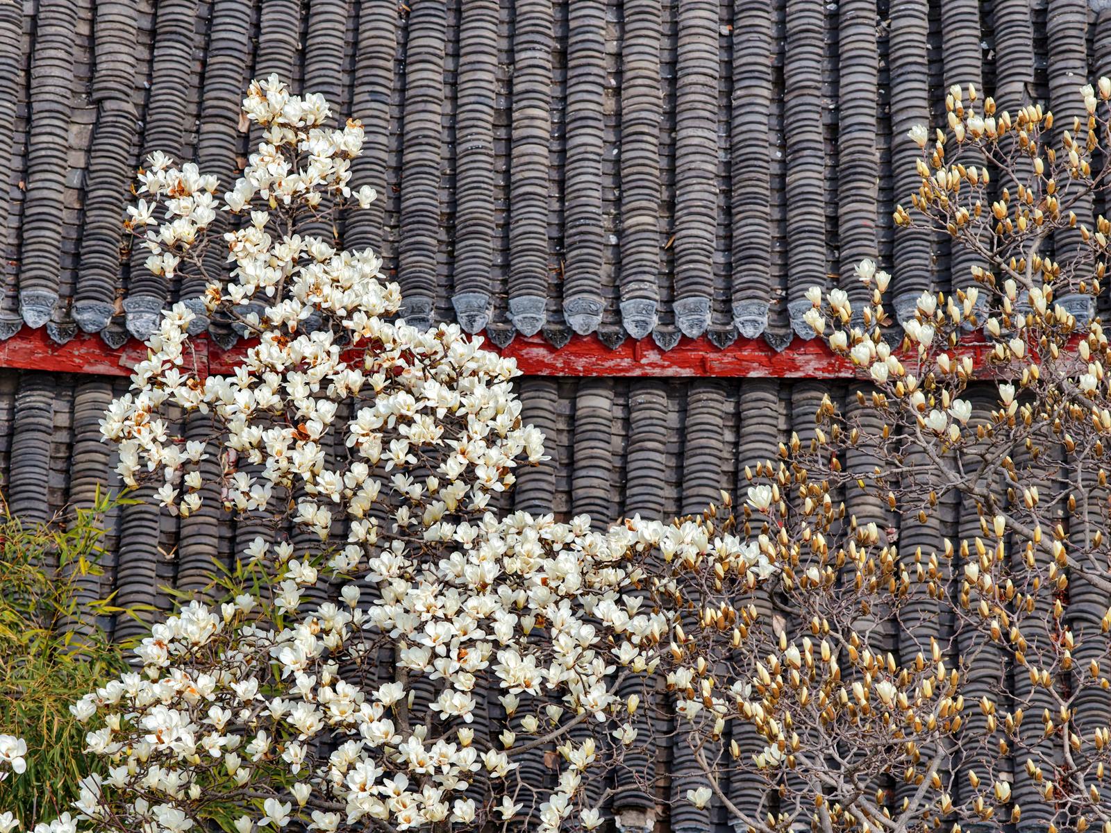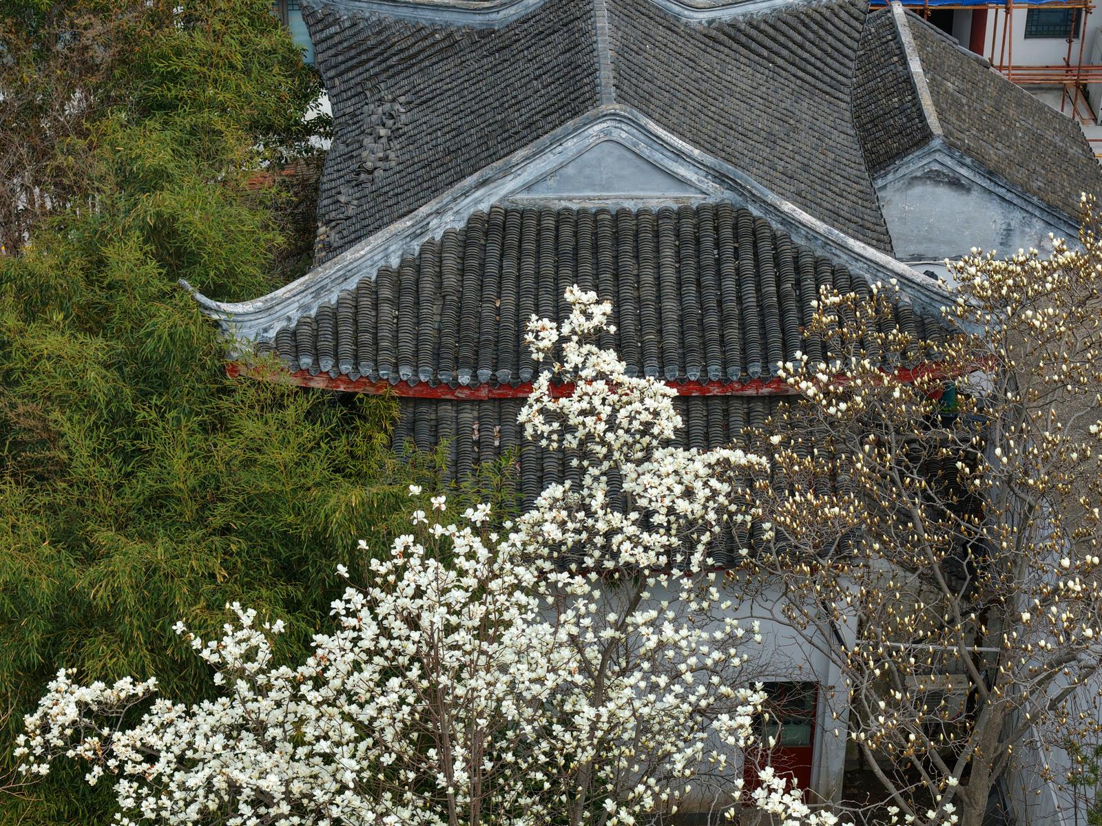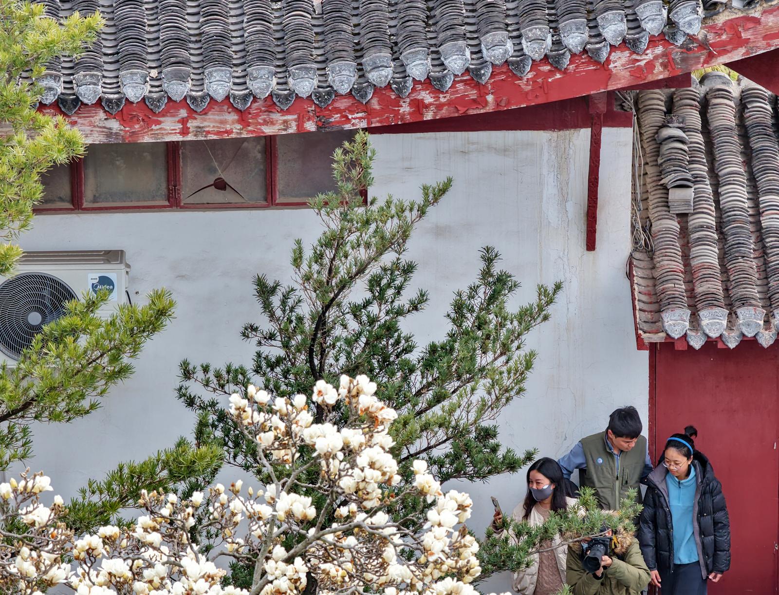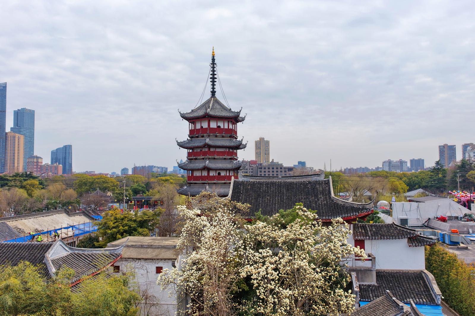 2026年3月8日拍摄的南通文峰塔和玉兰花美丽景色。眼下,在文峰塔附近的多株玉兰逐渐盛放,与文峰塔相映成景。南通文峰塔为南通三塔之冠,位于文峰公园北侧,有一组明清建筑,园林风光别具一格。