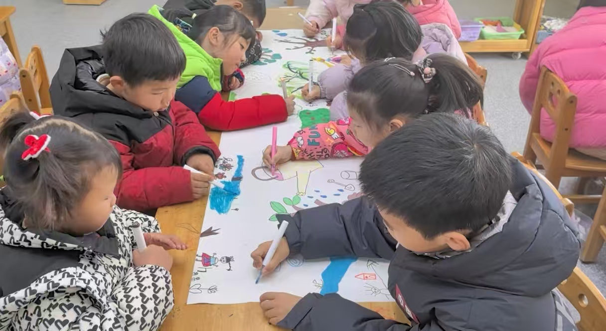 户外植树环节结束后,社区网格员与幼儿园老师带领孩子们开展植树节主题绘画活动。孩子们拿起五彩画笔,用纯真的视角勾勒心中的绿色家园:挺拔的小树、茵茵的草地、蔚蓝的天空、温暖的太阳跃然纸上。大家细心涂色、精心创作,一幅幅童趣盎然的作品,不仅展现了对大自然的真挚热爱,更在心底播撒下植绿、爱绿、护绿的环保种子。