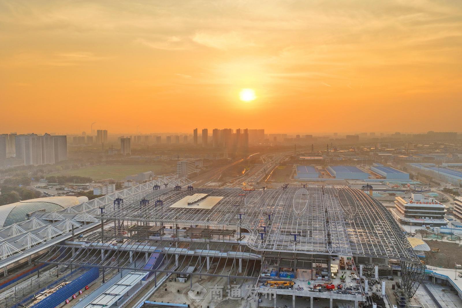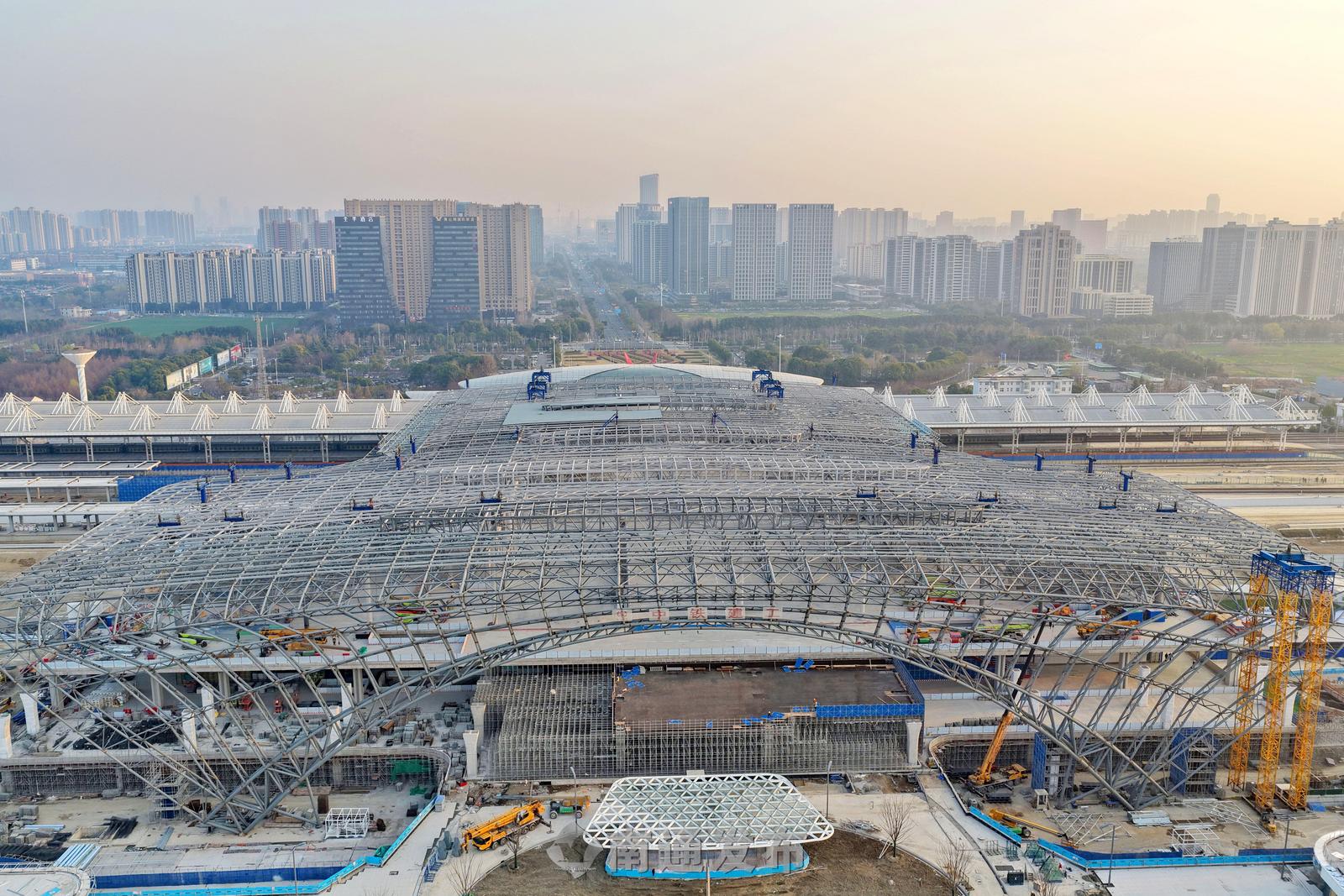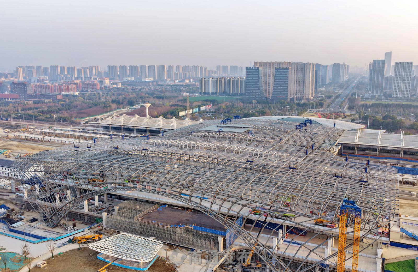 2026年3月13日,由中铁建工集团施工的新建南通站站房及相关工程施工现场一片繁忙,800多名工人正在进行金属屋面、装饰装修及幕墙施工。