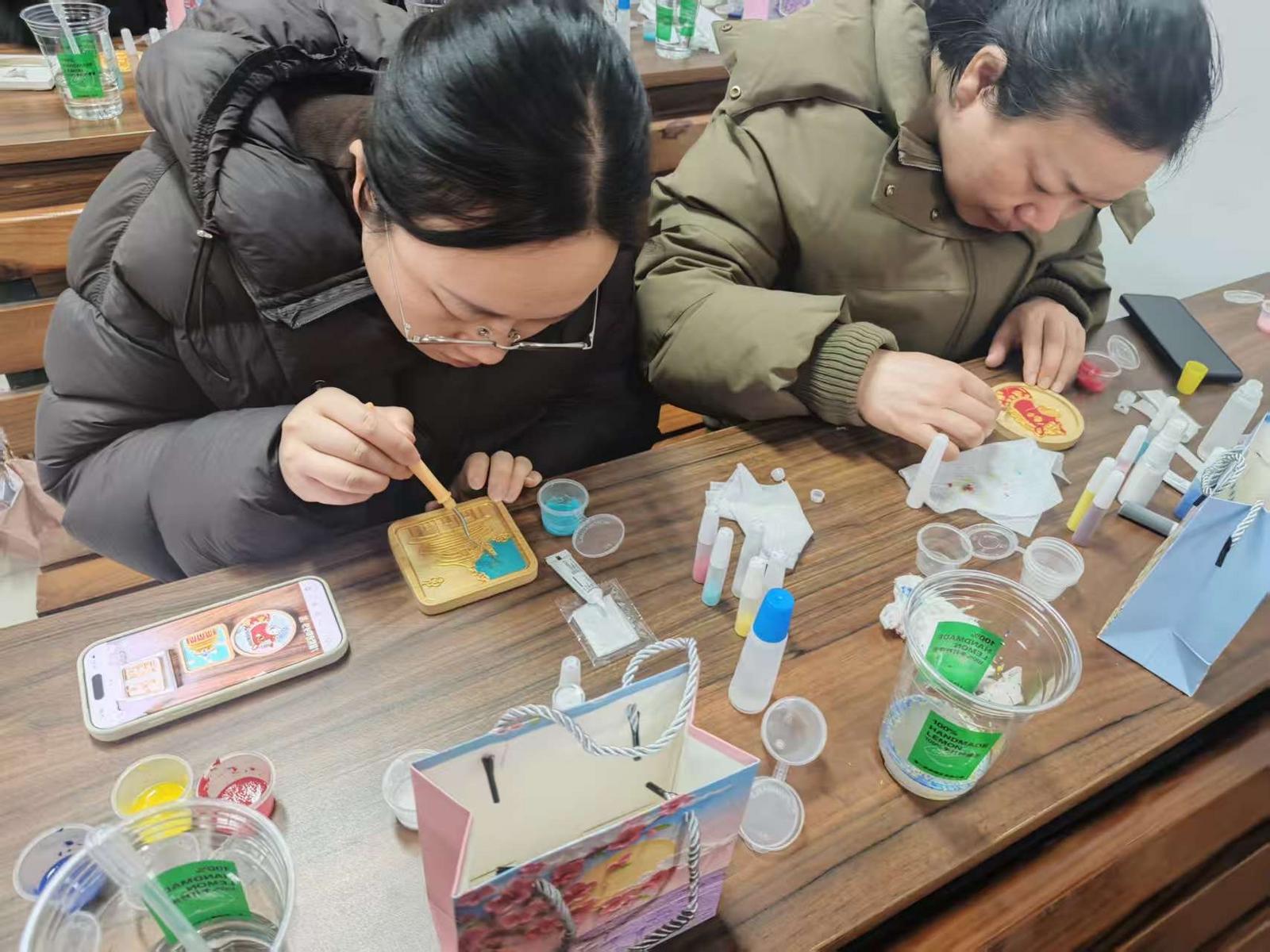 在为乘客送去祝福同时,南通飞鹤公交也将关爱延伸至企业内部女职工。一场别开生面的手工体验活动温馨开展,女职工们在专业老师指导下,亲手制作珐琅彩绘杯垫。从色彩搭配到图案勾勒,大家在指尖流转中融入创意与心意,制作出一件件独具匠心的珐琅作品,让女职工们感受到传统工艺的魅力。