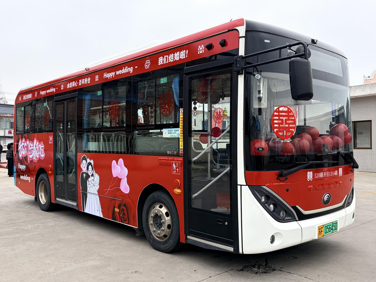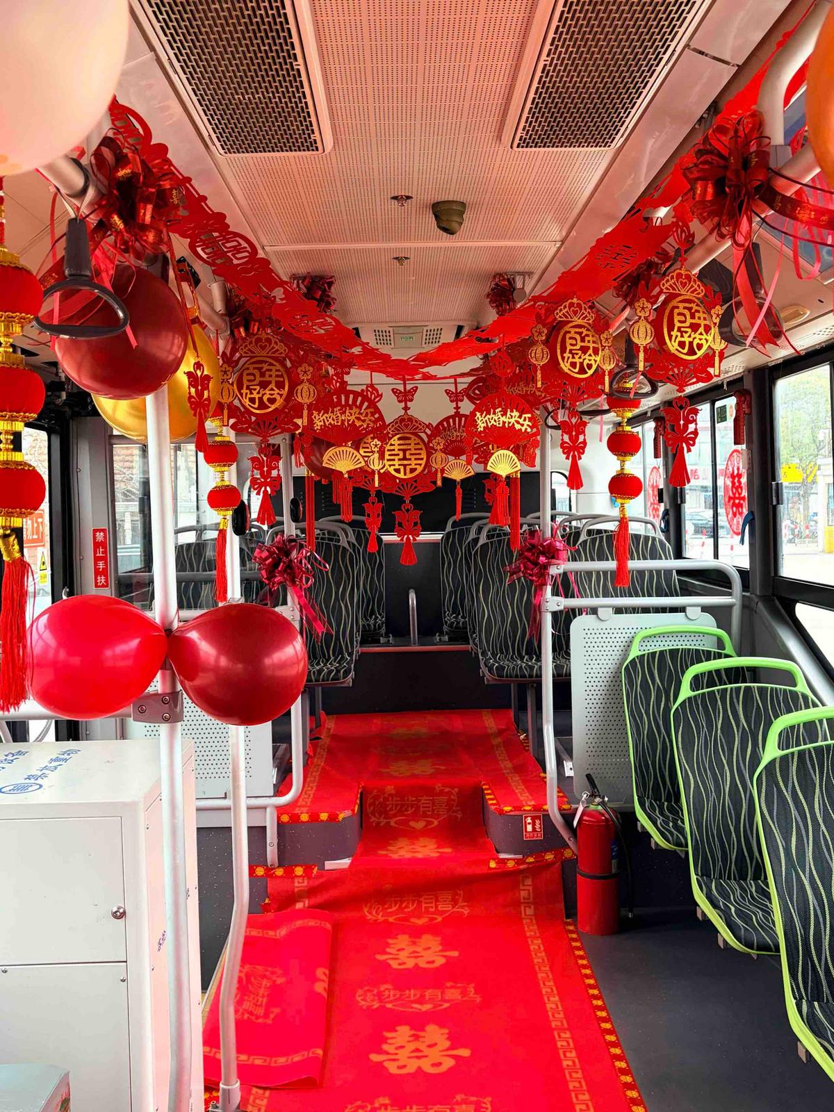 婚礼前,婚庆公司对车辆精心装饰,整车贴满了红色的装饰和“永结同心、百年好合”的字样;车厢内挂满绣球与彩色气球,扶手缠绕着红绸,20余个座位变成“幸福亲友团专座”,既保留了公交的宽敞舒适,又营造了婚礼的温馨氛围。车厢满载着新人和亲朋好友,大家一路唱歌互动,充满了温馨与欢乐。新娘笑着表示,这样的接亲方式文明简约,也让婚礼多了份独一无二的纪念意义。