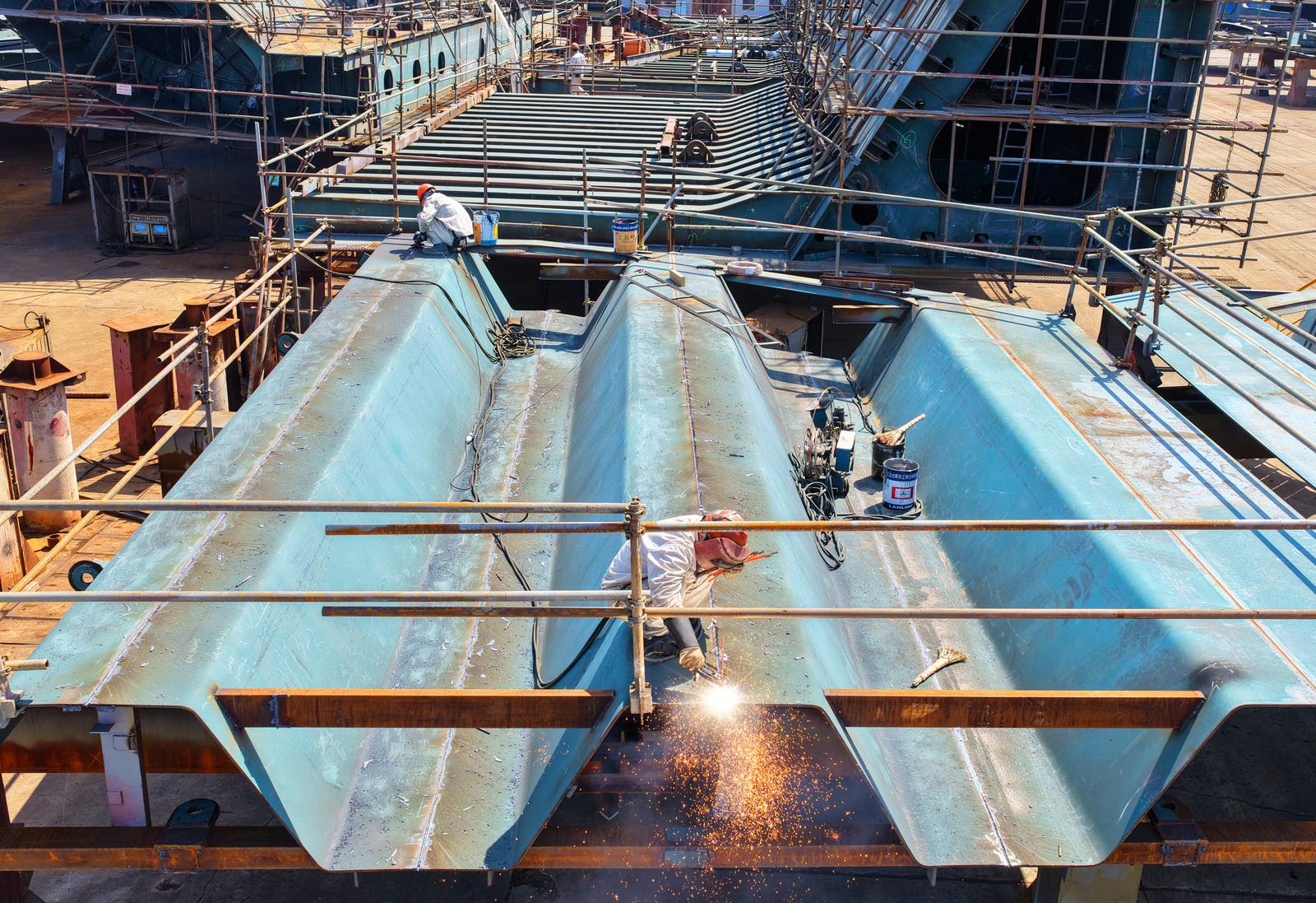 21日,在位于如皋市长江镇的江苏海通海洋工程装备有限公司,工人们正在赶制中外订单产品。据悉,该企业订单已经排至2029年,预计今年交付各型船舶19艘,年造船完工量突破100万载重吨。