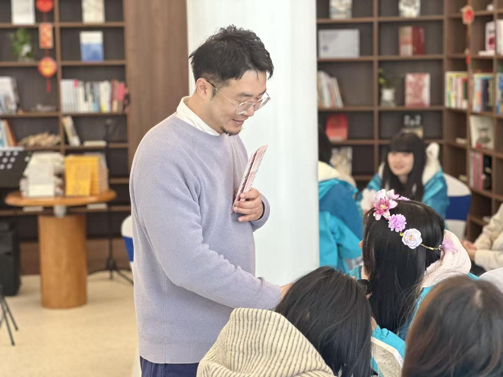 “春分时节民间会派送印有全年节气的物件,祈盼五谷丰登,这个物件是什么?”“小楼一夜听春雨,下一句是?”“识春分·知花典”上,学生踊跃抢答,在知识竞赛中深化民俗文化认知。“护绿苗·传书香”绿书签行动中,大家认真学习正版书籍鉴别技巧,让“绿色阅读、文明阅读”的理念入脑入心。花束辗转间,“击鼓传花”将氛围推向高潮,杏花与春分相关的诗词朗诵声此起彼伏……
