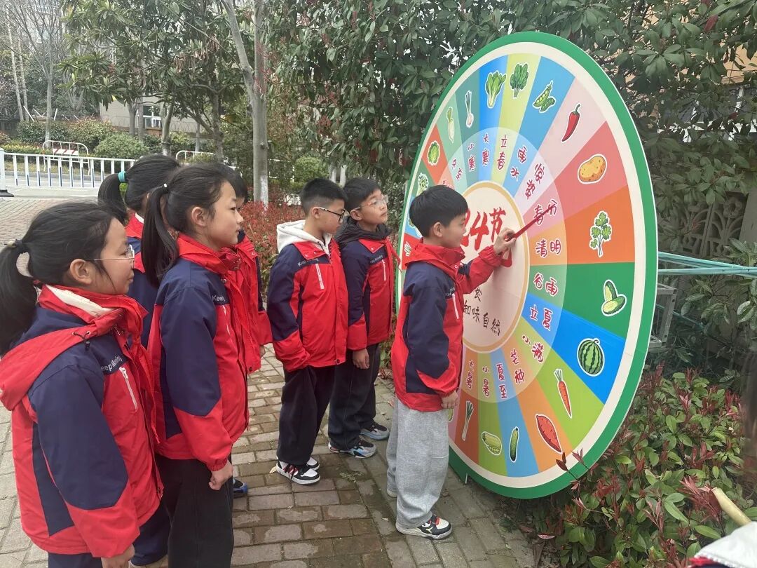 种植结束后,孩子们围聚在二十四节气转盘展板前,立春、雨水、惊蛰、春分……一个个节气旁点缀着生动的农作物图案,引得大家驻足观察、轻声讨论,一场自然与文化的探索之旅,在不经意间悄然开启。
