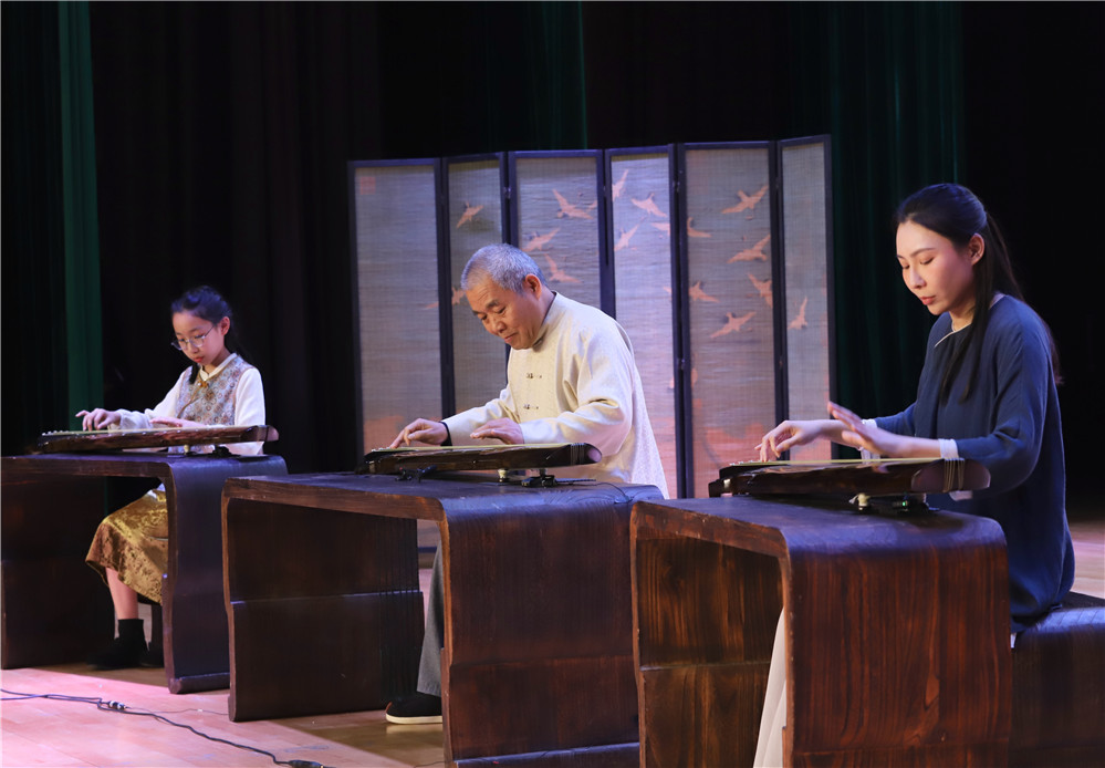 音乐会下半场更是名家云集,精彩纷呈。南通大雅琴社社长洪辰演奏的《乌夜啼》意境深邃;杭州太音琴社副社长陈昊宇的《广陵散》气势磅礴;苏州昆山琴社社长冷轶华带来的《仙珮迎风》缥缈铿锵;上海松江吴松古琴社社长施俭一曲《平沙落雁》抒写逸士胸襟;苏州吴门琴社社长吴明涛奏响的《白雪》尽显高洁之志;济南德音琴社社长王笑天以一曲富有山东韵味的《渔樵问答》赢得了满堂喝彩。 音乐会在裴金宝、裴琴子、裴思越三代同台合奏的经典名曲《梅花三弄》中圆满落幕,琴声苍古润劲,韵味悠长,生动诠释了古琴艺术代代相传的生机。