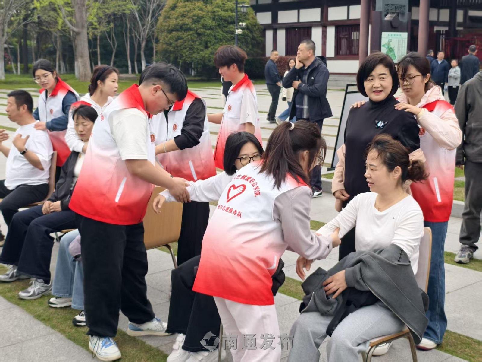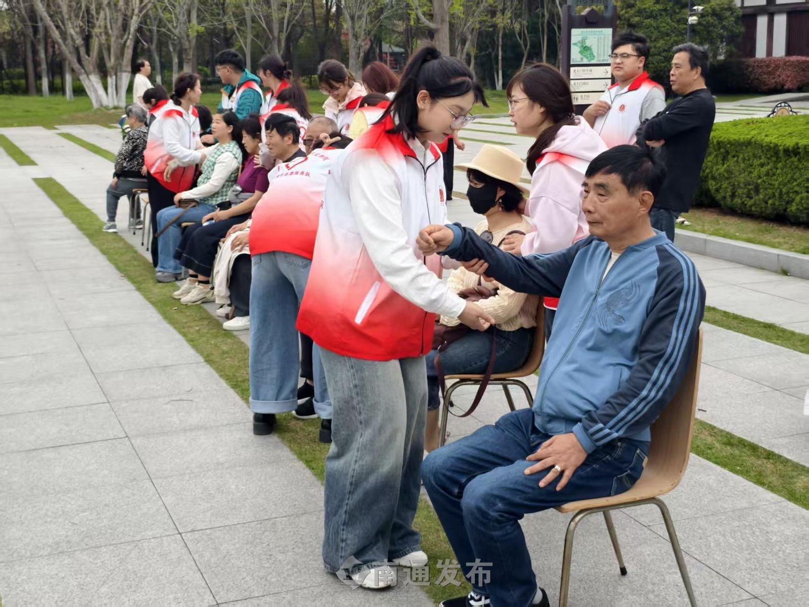 4月11日上午9时,狼山风景区北门广场人头攒动。C南丁格尔志愿服务队20名志愿者准时就位,推拿按摩、量血压、递上中药茶饮,贴心服务一亮相就吸引了大批踏青游客。
