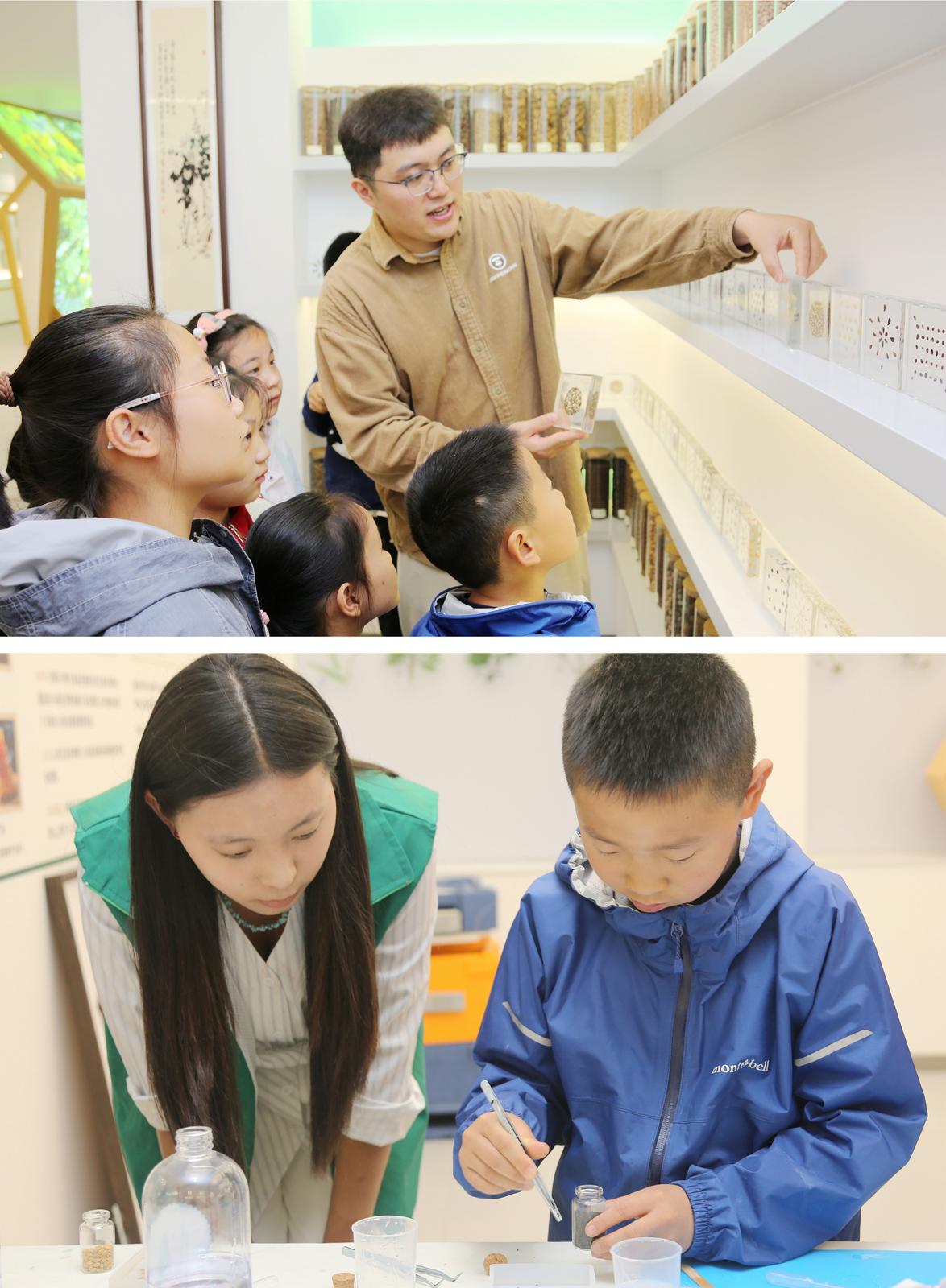 活动以一段粮食安全科普短视频开场。短片生动展示了粮食从田间到餐桌的完整旅程,让孩子们直观感受到每一粒粮食的来之不易,也对节约粮食、保护耕地的重要意义有了初步认识。随后,学院教师杜海涛带领孩子们步入农耕馆展区,开启沉浸式粮食安全科普课。杜海涛从“什么是粮食安全”讲起,结合馆内陈列的种子标本,详细讲解种子的结构、生长过程等基础知识,并引出种子对于国家安全的战略意义。“中国人的饭碗要牢牢端在自己手中”——他指着形态各异的种子,用这一形象比喻,帮助孩子们理解粮食安全与国家发展的密切关系。在农具展区,杜海涛借助传统农耕器具,生动还原了从播种到收获的全过程。参观结束后,活动进入动手实践环节。在学院志愿者指导下,孩子们用五颜六色的种子亲手制作标本。在专注操作中锻炼耐心与创造力,于指尖触碰间进一步深化了对粮食安全的认知。